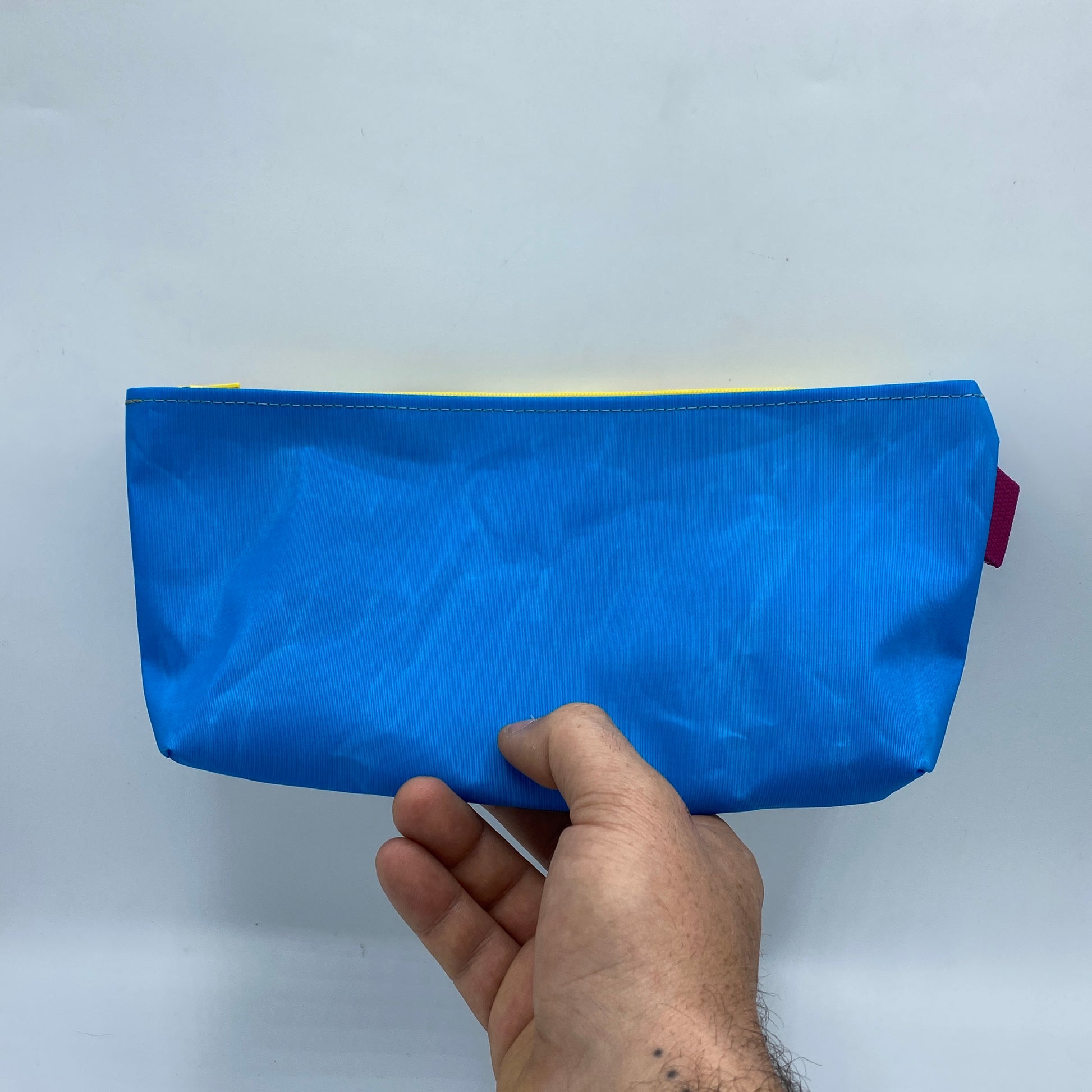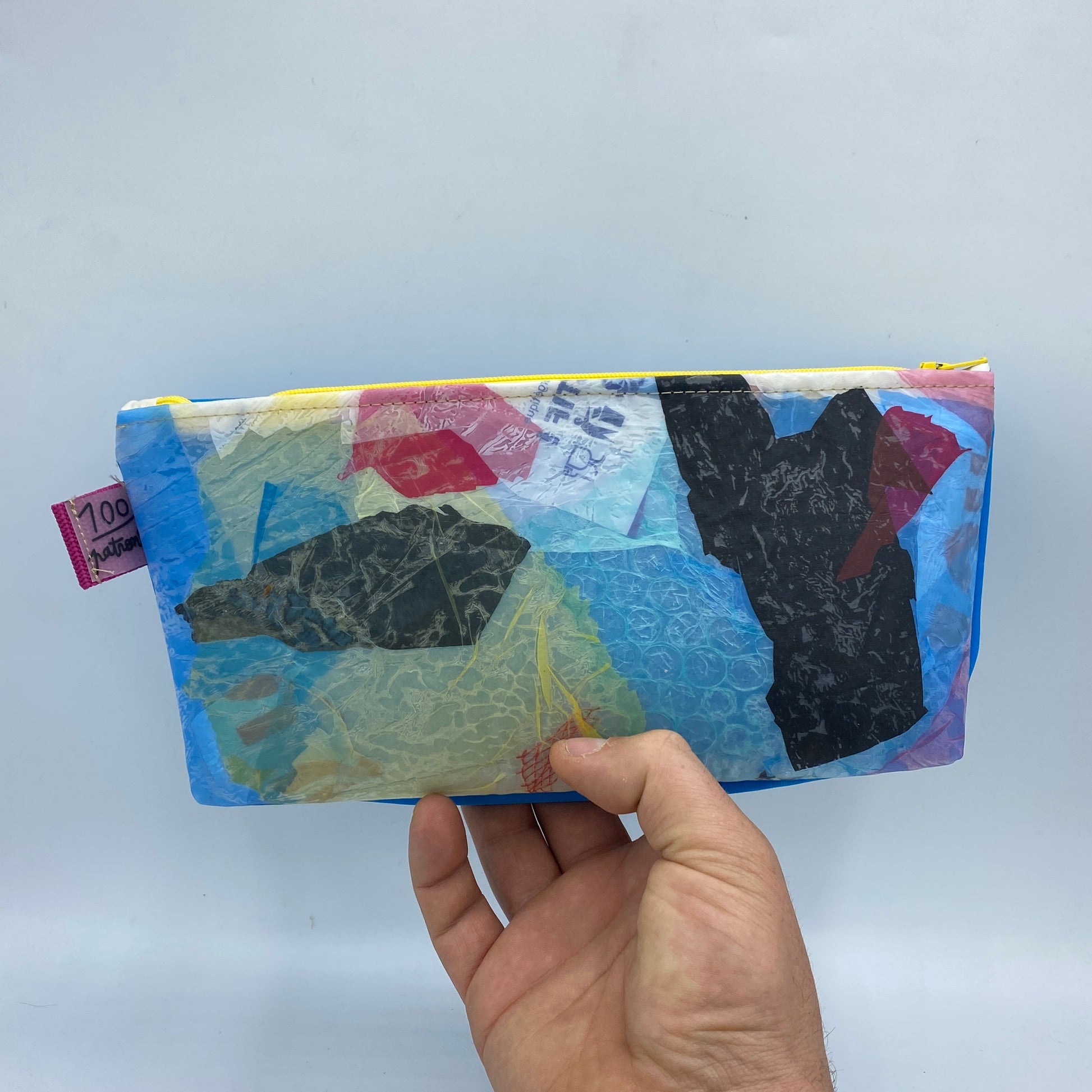 Cette trousse est entièrement fabriquée à la main dans notre atelier à partir de sacs plastiques upcyclés et de voile de bateau recyclée.
