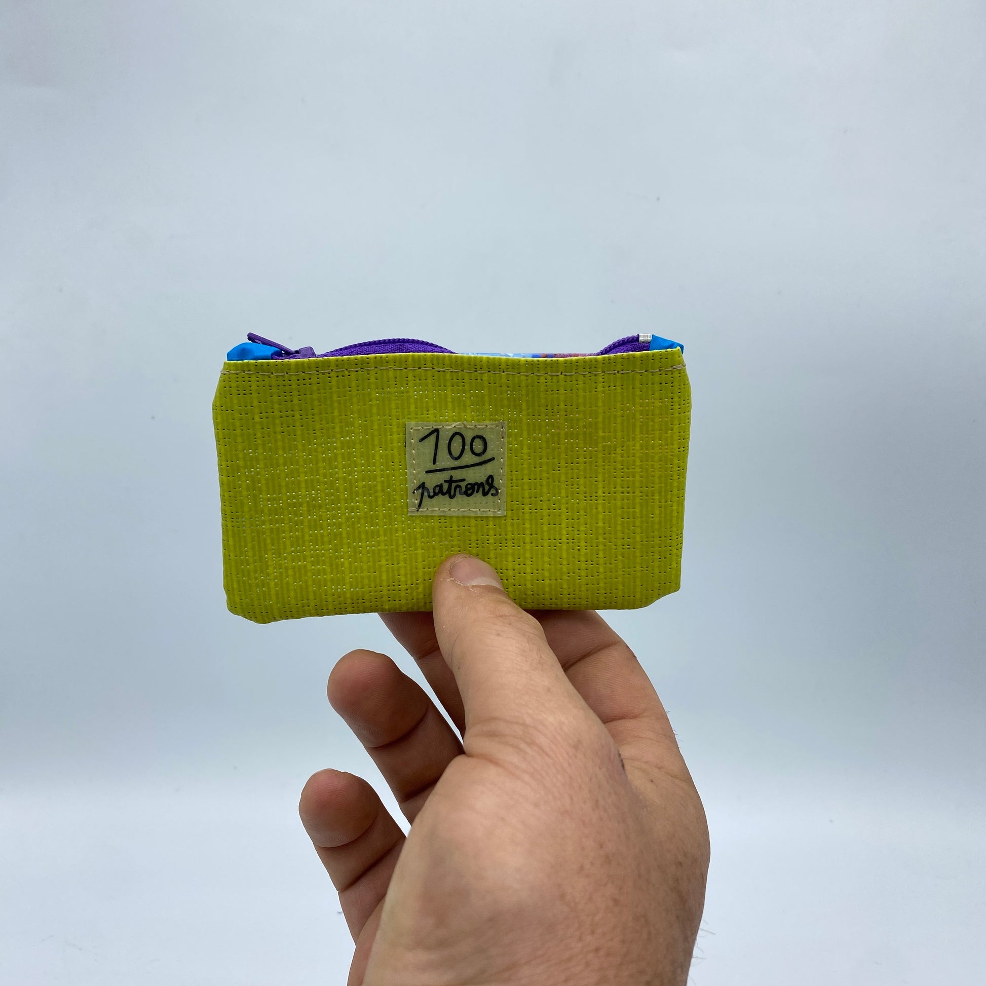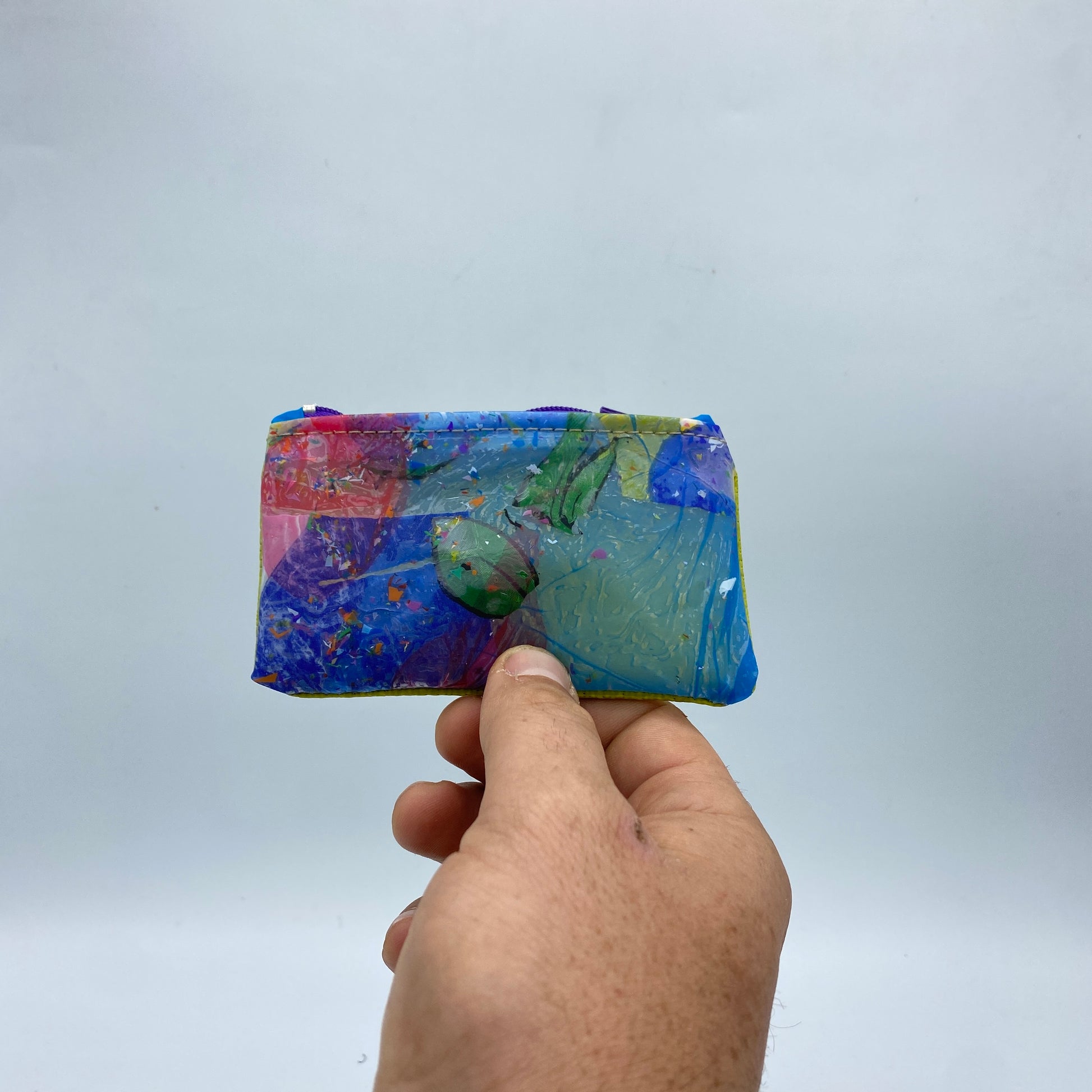 Ce porte-monnaie est entièrement fabriqué à la main dans notre atelier à partir de sacs plastiques upcyclés et de voile de bateau recyclée.